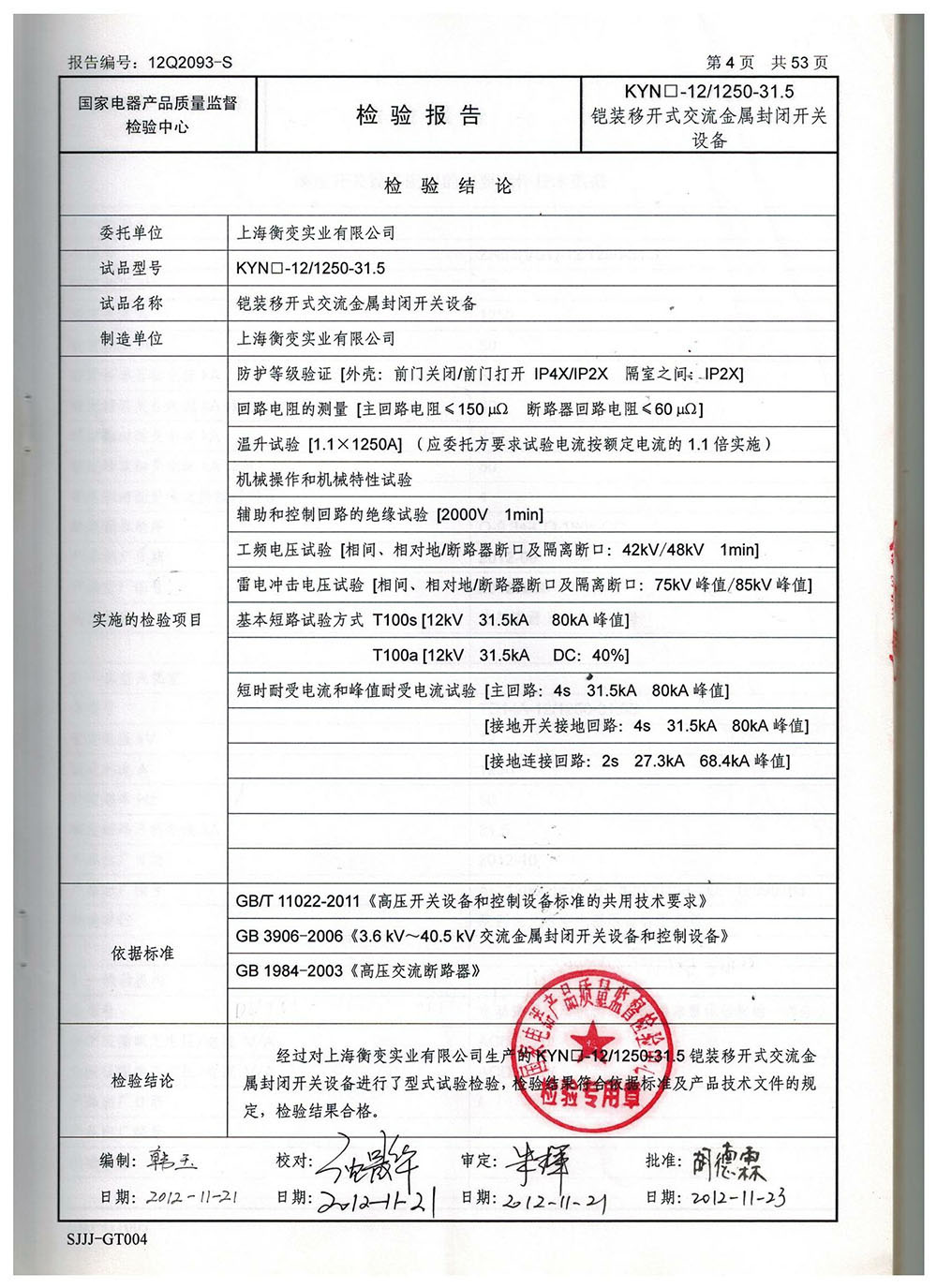 KYN口-12/1250-31.5铠装移开式交流金属封闭开关设备